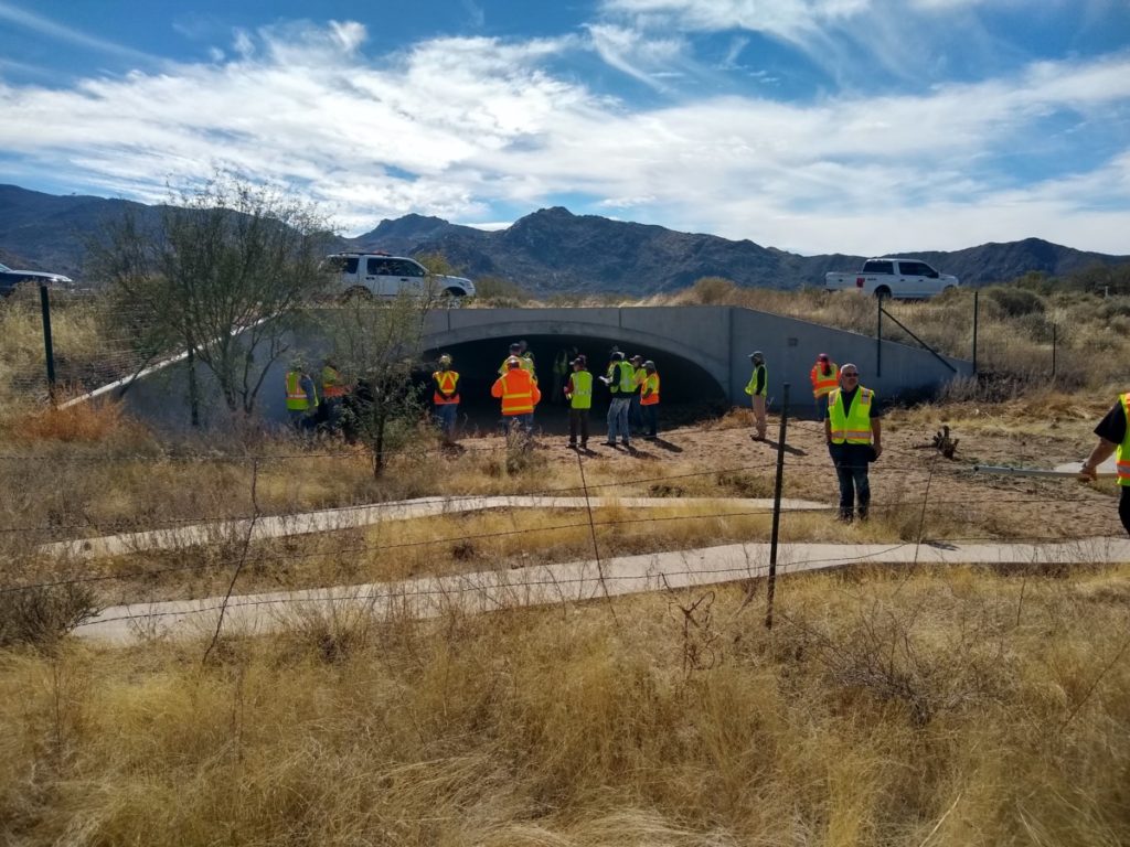 In January 2022, a group of people from Arizona Game and Fish Department, Arizona Department of Transportation, the Tohono O’odham Nation, and the Coalition for Sonoran Desert Protection conducted a scouting field trip to finalize the locations of two new wildlife bridges on SR86 near Kitt Peak. These bridges will complement two existing wildlife underpasses built nearby in 2013-2014. During the trip, the attendees also visited the underpasses and associated wildlife fencing and were able to identify ongoing maintenance tasks so these underpasses continue providing a safe crossing location for wildlife for many years to come.