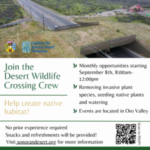 Sign up to become a part of our Desert Wildlife Crossing Crew and help us create and maintain native habitat on the Oracle Road Wildlife crossings! Habitat Restoration Days will be held once a month for 12 months.