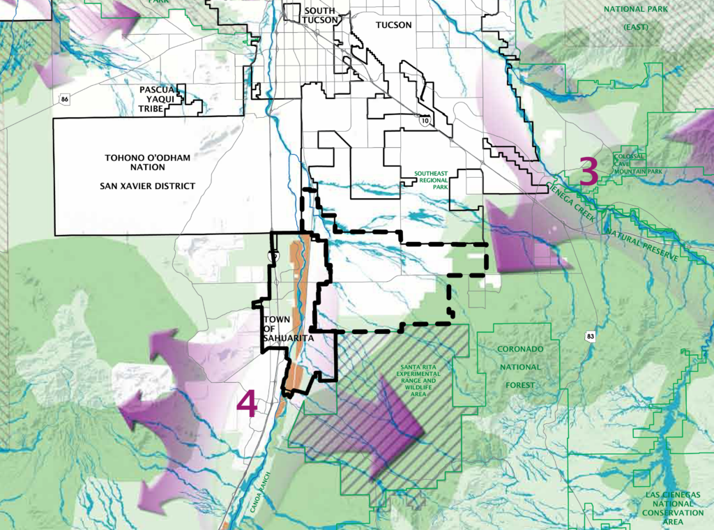 The Town of Sahuarita sits just northwest of two regional wildlife corridors: the first across Interstate 10 at Cienega Creek, and the second which crosses Interstate 19 and the Santa Cruz River in southern Pima County (respectfully, “3” and “4” in the map below).