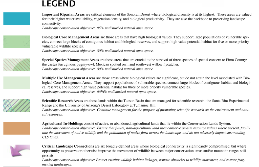 As part of the general plan update, we asked Sahuarita to bring existing conservation plans along with any land they annex into the Town. That would mean adopting Pima County’s award-winning conservation policy guidelines, known as the Conservation Lands System or CLS, into Sahuarita.