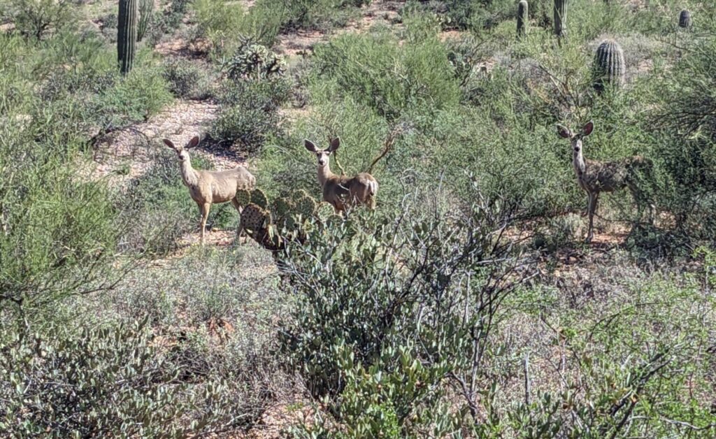 Mule deer doe trio exploring a Sonoran Desert shrub land.